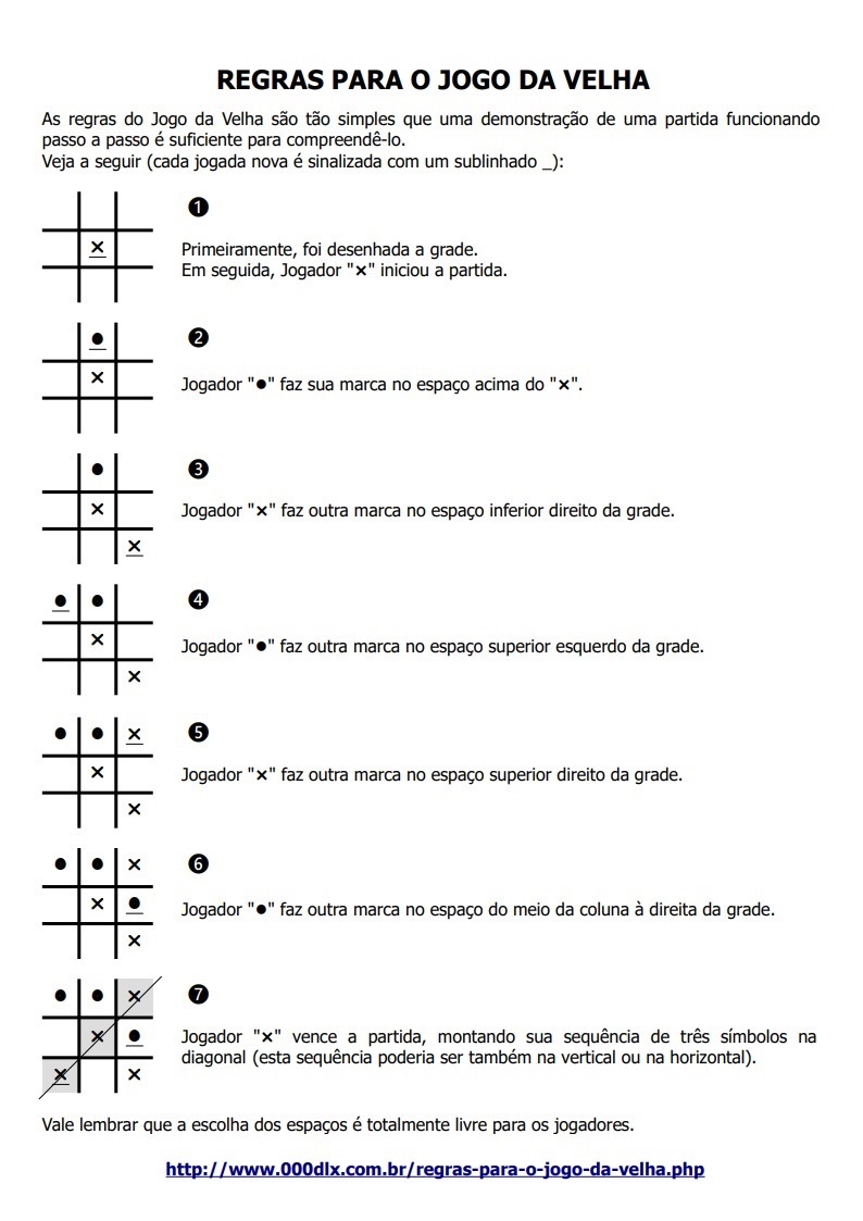 Regras do Jogo da Velha para ImprimirMelhor do que listar regras genéricas sem ilustrações é mostrar o próprio jogo funcionando. As regras são tão simples que basta acompanhar uma única partida para aprender o seu funcionamento. Caso queira imprimir a demonstração da partida dada nesta página ou analisá-la de forma mais compacta, você pode usar o arquivo a seguir...